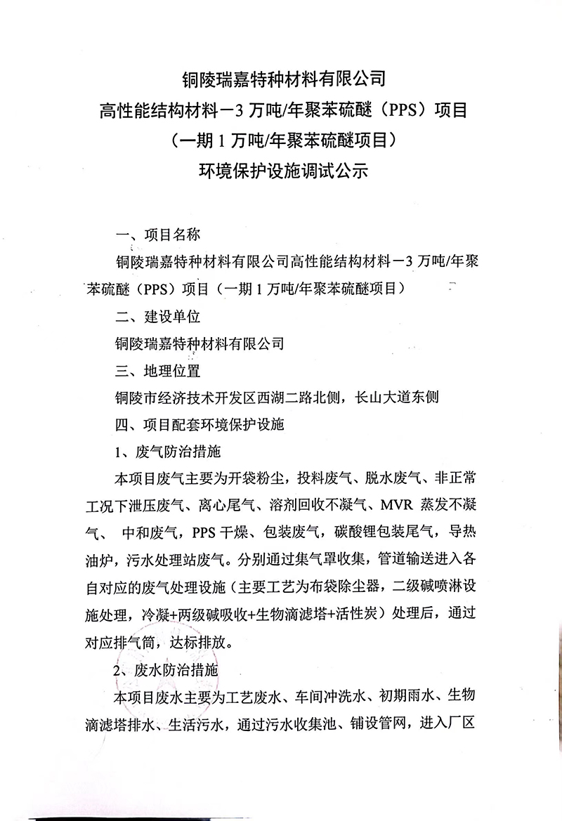 高性能結構材料-3萬噸/年聚苯硫醚(PPS)項目 (一期1萬噸/年聚苯硫醚項目) 環境保護設施調試公示